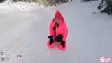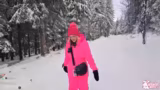 01:14:13Mit der neuen Ausrüstung unternimmt der Streamer einen ersten Versuch, sich im tiefen Schnee fortzubewegen. Er findet die Bewegung sehr anstrengend und seine Finger sind zunächst noch kalt. Der humorvolle Kontrast zwischen seiner auffälligen pinken Farbe und der verschneiten Landschaft wird hervorgehoben.