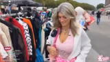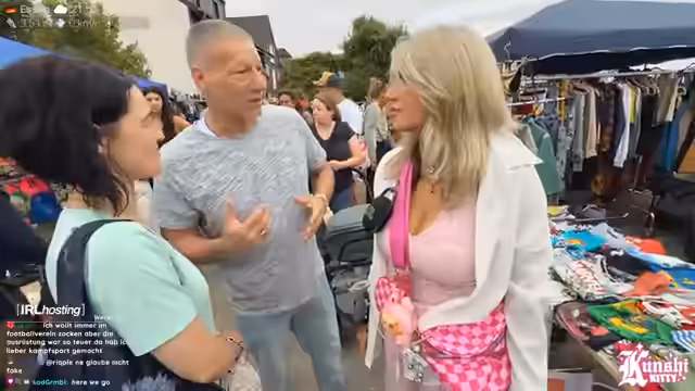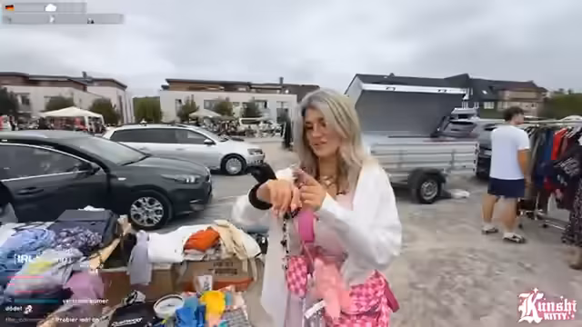 01:42:51Das Team erkundet einen Flohmarkt. Die Streamerin ist begeistert von der Vielfalt der angebotenen Artikel, von antiken Schmuckstücken und Silberbesteck bis hin zu Nostalgieartikeln wie Gameboys, Pokémon-Boostern und Lego. Sie äußert ihre Begeisterung für Butterfässer und Gitarren aus Kirschholz. Sie unterhält sich auch über verschiedene Kleidungsstücke, darunter ein Hochzeitskleid, und stellt sich vor, wie sie es tragen würde. Sie betont, dass viele Stände Erlös für den Tierschutz spenden.