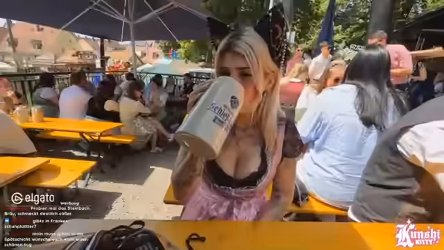 07:38:28Nach mehreren Stunden im Biergarten und bei extremen Temperaturen nähert sich das Event dem Ende. Die Streamerin ist körperlich erschöpft und unsicher, ob sie die restliche Zeit durchhalten wird. Sie hat bereits genug getrunken und denkt an die nachfolgende Zeit, in der sie sich erholen und ihren Kalorienverbrauch kontrollieren muss. Die Hitze und die Hitze sind die bestimmenden Faktoren für den Rest des Streams.