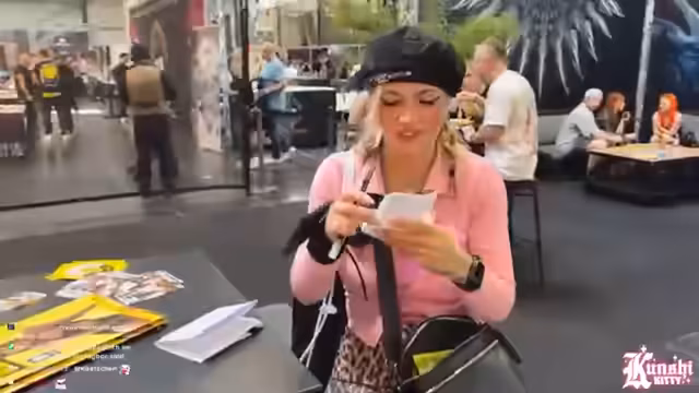 07:48:35Beim Durchlaufen der Messe wird das interaktive Tattoo-Bingo fortgesetzt, wobei man auf eine Gruppe trifft, die ein Arschgeweih und ein Datum als Tattoo vorweisen kann. Es folgt eine Begegnung mit einer Familie, die die Streamerin erkennt und ein Foto wünscht, wobei man sich über die Reichweite auf TikTok austauscht. Schließlich wird das Bingo vollendet, als ein Messebesucher mit einem Löwen-Tattoo entdeckt wird, womit alle Felder abgehakt sind und das Spiel erfolgreich beendet wird.