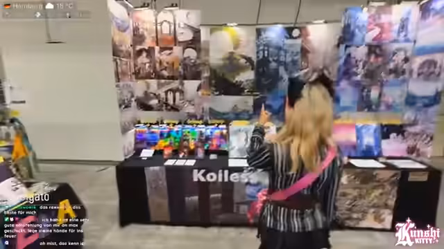 06:04:50Der Streamer erkundet verschiedene Hallen der Polaris und nutzt die Gelegenheit zum Einkaufen. Sie berichtet von ihren Einkäufen, darunter Katzenohren und eine Mütze für einen Gesamtpreis von 110 Euro, und beschreibt dies als „mega Cosplay“. Sie besucht verschiedene Stände, darunter einen mit veganen Kekse von AMDU, die sie sehr lobt, und einen Stand mit handgefertigten Plüschfiguren, von denen sie einen „Patrick“ erwirbt. Ihr gesamter Ausgabenstand für den ersten Tag beträgt 125 Euro.