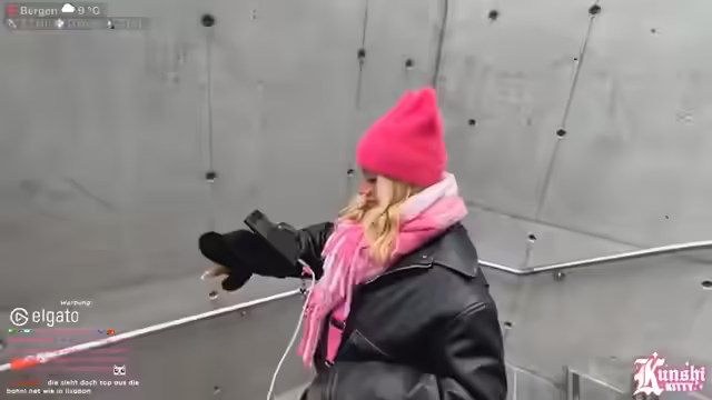 00:38:07Während der Fahrt mit der Standseilbahn auf den Berg Fløyen äußert sich die Streamerin besorgt über die Sicherheit. Oben angekommen, wird die Aussicht trotz des Nebels als lohnenswert empfunden. Es wird eine Insta-Story gedreht und ein Selfie gemacht. Der Berg wird als Fleuen identifiziert und seine Höhe mit etwas über 400 Metern angegeben. Ein Panoramafoto wird aufgenommen, wobei die alten Häuser im Hafenbereich als nächstes Ziel ins Auge gefasst werden. Der Weg nach unten durch ein Waldstück wird aufgrund der Rutschgefahr und des potenziell schlechten Empfangs diskutiert. Die Geräusche der Autos, die bis zum Berg hinaufdringen, werden als überraschend laut empfunden. Es werden Ziegen gesichtet, und die Streamerin äußert eine gewisse Angst vor ihnen.