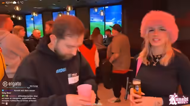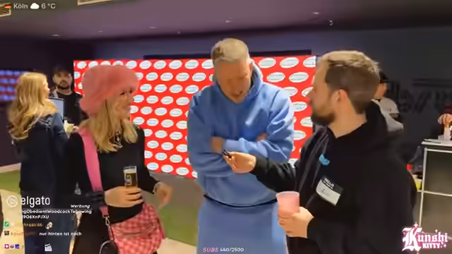 02:23:10Nach der Stadiontour wird wieder an die Holy-Party zurückgekehrt. Hier übernimmt ein anderer Streamer für eine Weile, während sich die Gruppe über verschiedene Themen unterhält. Es gibt Diskussionen über die Erwartungen an den bevorstehenden Karneval in Köln, die Straßen und die Atmosphäre. Auch persönliche Anekdoten wie eine Laser-OP mit anschließenden Komplikationen werden geteilt. Immer wieder wird auf die Präsentation von internationalen Süßwaren auf der Messe hingewiesen.