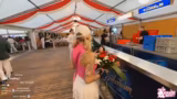 03:55:03Auf dem Kirmesgelände wird eine kleine Verkostungssession durchgeführt, bei der verschiedene Snacks wie Gyros-Gurken, Reibekuchen und Kartoffel-Twister probiert werden. Die Streamerin erhält von einer Besucherin eine Gurke geschenkt. Anschließend wird versucht, verschiedene Münzschiebeautomaten zu spielen, was jedoch nur geringen Erfolg bringt. Parallel dazu wird über mögliche Allergene in den verkauften Speisen gesprochen und Vegetarieroptionen in Betracht gezogen.