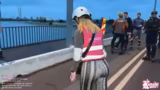 00:21:29Zu Beginn der Fahrt treten erhebliche technische Probleme auf. Die vom Event bereitgestellte Musikanlage fällt mehrmals komplett aus, was die Atmosphäre stark beeinträchtigt. Parallel dazu präsentiert sich die Strecke als sehr anspruchsvoll, mit vielen welligen und unebenen Flächen sowie tiefen Schlaglöchern. Die Streamerin äußert sich über die Gefahren durch den Gegenwind und die Möglichkeit, dass ihre Hose reißen könnte.
