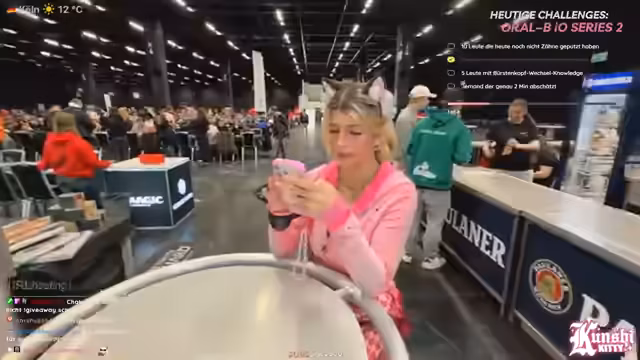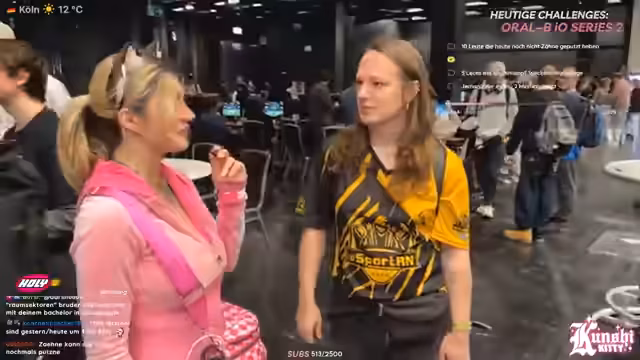 01:33:04Auf der Gamescom-LAN wird eine interaktive Challenge durchgeführt, bei der Teilnehmer gefunden werden, die sich noch nicht die Zähne geputzt haben. Dies dient als humorvolle und unkonventionelle Interaktion mit Besuchern und Chat. Dabei wird gleichzeitig eine Umfrage zum bevorzugten Zahnbürstentyp (elektrisch vs. Handzahnbürste) durchgeführt, wobei Oral-B als Partner im Fokus steht. Der Streamer bemerkt, dass es auf einer LAN üblich sein kann, morgens zunächst mit anderen Dingen zu starten, bevor man zur Zahnhygiene übergeht.