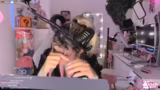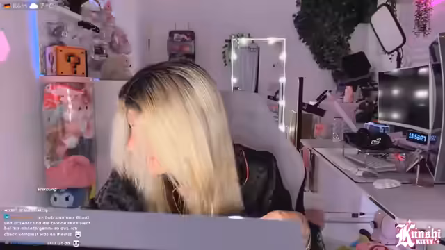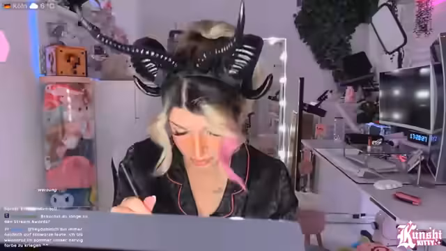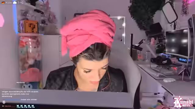 01:07:27Obwohl ursprünglich der Verzicht auf Experimente angekündigt wurde, entscheidet sich der Streamer spontan für eine Risiko: Sie färbt eine Haarsträhne mit einer vorübergehenden, rosa Farbe. Dieses Experiment führt zu Chaos, da Farbe auf die Hände gelangt und die restliche Frisur zu zerstrieren droht. Gleichzeitig wird auch das Makeup mit starkem Haarspray fixiert, was zu Geruchsbelästigung führt.
