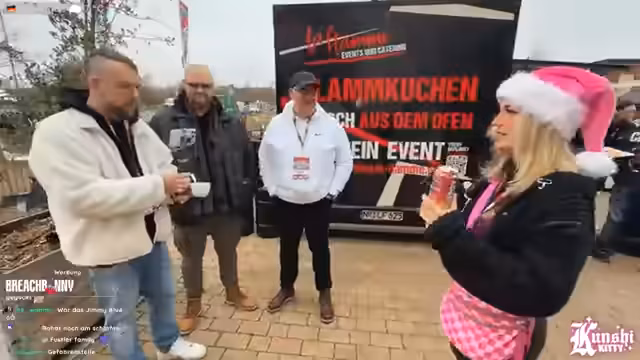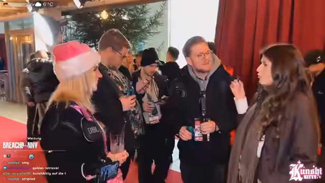 06:51:59In dieser Szene, die von 24719 bis 24857 reicht, begrüßt eine Person andere Teilnehmer des Events, darunter Kuchikitty. Es wird die Frage nach dem Alkoholgehalt eines Getränks gestellt, das als Gönner-Gin bezeichnet wird. Die Teilnehmer klären, dass das Getränk alkoholfrei ist. Es findet ein Ratespiel statt, bei dem eine Person gefragt wird, welche Hunderasse sie wäre. Die Antwort 'Dackel' wird als perfekte und sympathische Antwort gelobt.