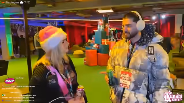 07:56:59Die Streamerin spricht mit einem anderen Streamer namens Donowall. Sie tauschen sich über den Verzehr von Pizza und gebrannten Mandeln aus. Donowall erwähnt, dass er seit dem Vormittag vor Ort ist und auf ein Buffet wartet. Anschließend diskutieren sie über Snowboarden, wobei Donowall einen Freund erwähnt, der sich dabei eine Elle und Speiche gebrochen hat und eine große Narbe davongetragen hat.