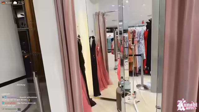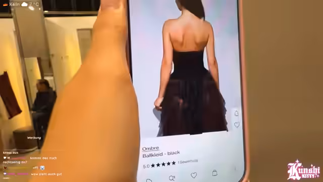 01:21:29Das Hauptthema des Streams ist die verzweifelte Suche nach einem neuen Kleid für die bevorstehenden Stream Awards. Nachdem sie mit einem bereits gekauften, schlichten schwarzen Kleid unzufrieden ist, beschließt die Streamerin, noch einmal in einem Geschäft zu stöbern. Sie äußert den Wunsch nach einem farbenfroheren und auffälligeren Outfit, das im Gegensatz zu dem eher unauffälligen Kauf aus der Vorwoche steht und den Erwartungen an eine glamouröse Preisverleihung gerecht wird.