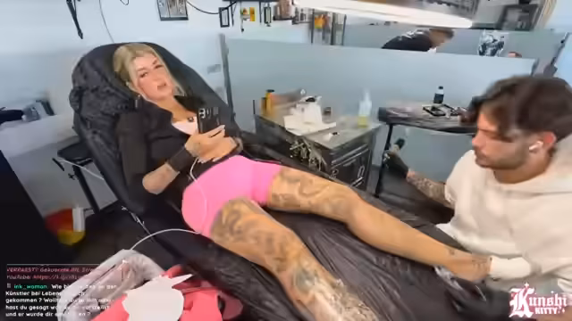 04:02:28Die Tätowierarbeiten beginnen mit den Outlines, die relativ schnell verlaufen. Die Streamerin berichtet von ihrem allgemeinen Befinden: Sie ist tiefenentspannt, obwohl sie sich an bestimmten Stellen, wie der Wade, Sorgen um den Schmerz macht. Sie lacht über eine Chat-Anfrage, ob sie Windeln wegen ihrer Periode trägt, und erklärt, dass sie durch die Einnahme der Antibabypille eine kontrollierte, schmerzfreie Abbruchblutung hat. Der Prozess des Schattierens wird als zeitaufwändiger beschrieben.