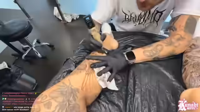 06:52:40Ein kurzer technischer Vorfall wird angesprochen. Der Streamer gibt an, ein Problem mit der Übertragung zu haben und bittet die Zuschauer, kurz die Sprache zu wechseln, um die Verbindung zu stabilisieren. Dieser kurze Zwischenfall wird schnell gelöst und der Stream normalisiert sich wieder, wobei die Qualität der Übertragung als gut empfunden wird. Danach geht es nahtlos mit dem Tattoo-Prozess weiter.