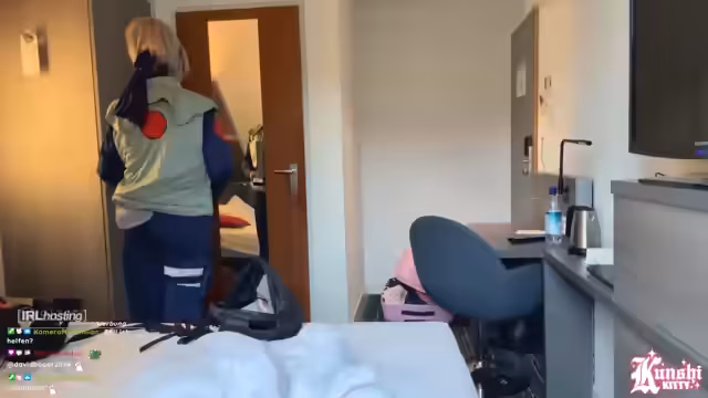 00:13:07Der Stream beginnt mit der Ankunft der Streamerin im Hotelzimmer nach der DOKOMI. Sie berichtet von stressigen Abend vor der Messe und von leichten Panikattacken, vermutlich aufgrund des gestressten Zeitplans. Sie kleidet sich für den Stream in ein weibliches Kakashi-Cosplay und beschreibt die Herausforderungen, insbesondere mit der Frisur und dem Tragen der Cosplay-Jacke. Sie erwähnt, dass sie nach dem dreitägigen Stream einen freien Tag benötigt, da sie komplett ausgelaugt ist.