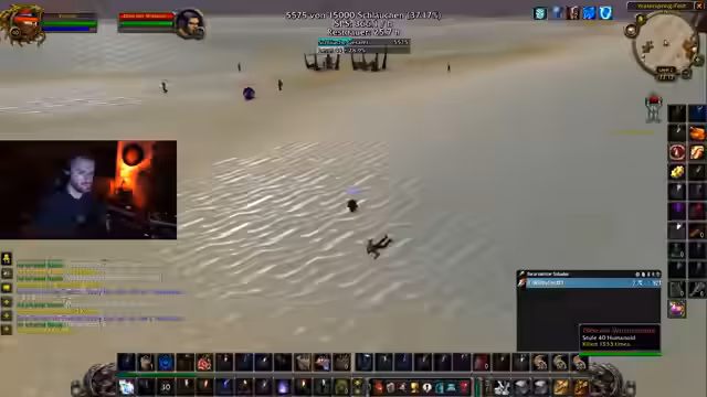 04:59:48Der Zug beginnt in Stratholme und die Gruppe zieht in den ersten Bereich ein. Der Streamer, als Tank, führt die Gruppe an und gibt klare Anweisungen zum Pull von Mobs, um die 'Argo' (Aggro) zu kontrollieren und für den Heiler ein Line-of-Sight zu schaffen. Es kommt zu einem kritischen Moment, als ein Mob den Heiler angreift und der Streamer intervenieren muss, um Schaden abzuwenden und die Stabilität der Gruppe zu gewährleisten.