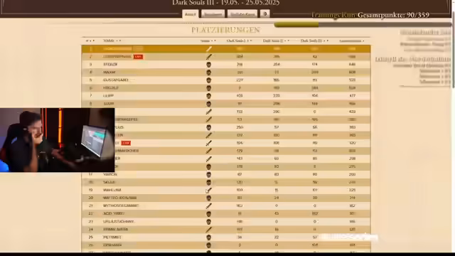 00:00:52Der Stream beginnt mit den typischen Begrüßungen der Community. Das primäre Ziel für den heutigen Run wird frühzeitig kommuniziert: zunächst sollen 100 Punkte erreicht werden, bei Erfolg wird das Ziel auf 150 Punkte angehoben. Der Streamer befindet sich in der Dark Souls 3-Tabelle und bemerkt, dass er eine schlechte Ausgangsposition hat, was ihn motiviert, gute Punkte zu sammeln. Es werden die aktuellen Tabellenstände der Konkurrenten wie Vasili und Basilika genannt, die es zu überholen gilt. Die Stimmung ist leger, der Streamer gibt offen zu, kaum geübt zu haben, was für potenzielle Underdog-Momente sorgt.