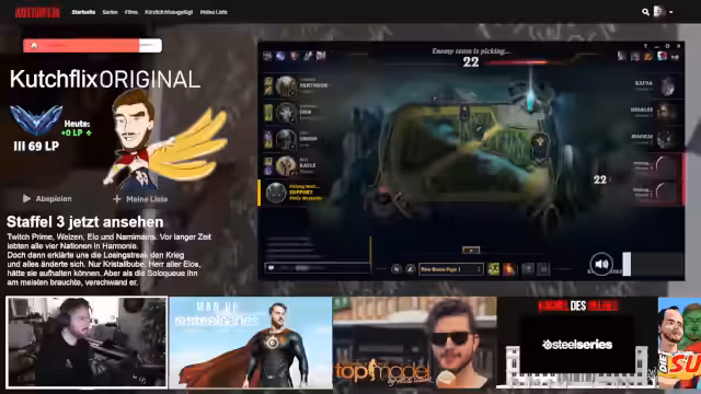 00:00:43Der Stream beginnt mit einem Early-Stream von League of Legends auf dem Kanal kutcherlol. Der Streamer erwähnt, dass er ein wenig müde und verknallt ist, aber bereit für eine schöne Runde League of Legends. Er unterhält sich mit dem Chat über verschiedene Spielmodi und stellt fest, dass er besonders der klassische Fan von Summoner's Rift ist. Kurze technische Probleme mit dem Spielstart werden erwähnt, aber schnell behoben. Streamer Marvin wird kurz gegrüßt und angesprochen.