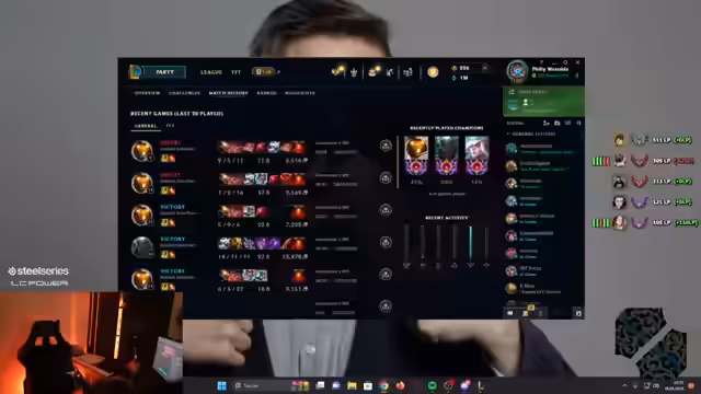 Nach der Konfiguration eines neuen PC-Setups wurde eine Partie League of Legends absolviert. Das Ziel war der weitere Aufstieg in der Rangliste. Dabei wurden Siege und Niederlagen verarbeitet und der Fokus auf die mentale Stärke gelegt, um das angestrebte Ziel zu erreichen.