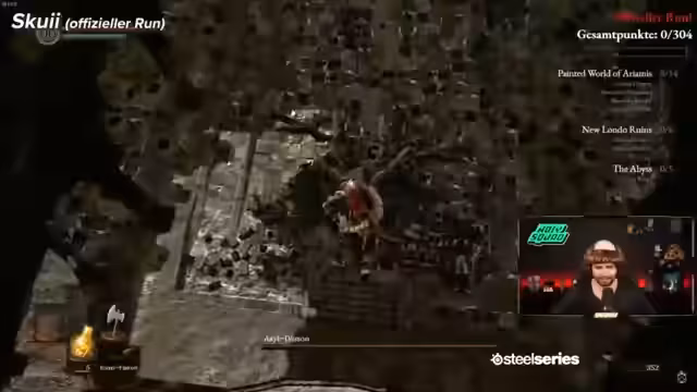 00:20:56Nachdem der Schmied in Majula besucht wurde, um Waffen zu verbessern, macht sich der Streamer auf den Weg zu einem anderen Schmied, da ihm Titanitscherben fehlen. Er erkundet neue Gebiete wie die Verlorene Festung und den Jägerhain, wobei er auf neue Gegner und Mechaniken wie das Lava-Umfeld stößt. Während der Erkundung kommt es zu einem massiven technischen Vorfall: In einem Wutausbruch schlägt er auf seinen Tisch, wodurch das Kabel seiner Webcam zerbricht und der Bildschirm zersplittert. Der Stream ist gezwungen, ohne Kamera weiterzumachen.