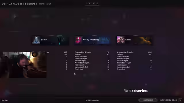 02:49:05Es wird über die Möglichkeit diskutiert, im nächsten Split gegeneinander zu spielen. Es wird bezweifelt, dass in der nächsten halben Stunde noch ein Win gelingt. Es wird beschlossen, Hotdrops zu machen und jeden Fight anzunehmen. Es wird über das Problem gesprochen, dass immer jemand zuerst stirbt. Es wird der Wunsch geäußert, besser zu spielen. Es wird festgestellt, dass ein Mitglied heute den meisten Schaden verursacht hat. Es wird beschlossen, auf die Rahmburst zu gehen. Eine legendäre Lootasy wird gefunden. Es werden Splitter gefunden und beschlossen, jetzt zu fighten. Die Gruppe wird von einem Monster gejagt. Ein Mitglied wird von einem Boss angegriffen und ist auf Hilfe angewiesen. Es wird festgestellt, dass die Gruppe tilted ist. Es wird über die kurze Dauer der Runden diskutiert. Ein Porter wird genutzt. Es wird überlegt, bei bester Gamer nominiert zu sein. Es wird beschlossen, zu shop. Es wird über die Kleinschwanz-Gang gewitzelt. Es wird beschlossen, direkt zu droppen. Es wird über göttliche Gegenstände diskutiert. Es wird beschlossen, eine Quest durchzulaufen. Es wird überlegt, wer was göttliches hat. Es wird überlegt, ob ein Teamkamerad ein Upgrade hat. Es wird beschlossen, in der Kolibri zu commiten. Ein Gegner wird geschnappt. Es wird festgestellt, dass die Runde gewonnen wurde.