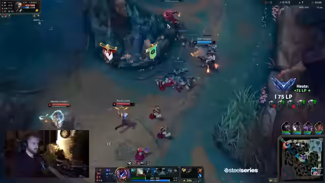 00:10:00Ein größeres Teamfight findet statt, in dem der Streamer meint, dass das Team einen unfairen Vorteil durch gesnackte Backline hatte. Allerdings kritisiert er stark den mangelhaften Map-Awareness und die Rotation seines Teams, was zu verpassten Chancen führt. Er äußert Frustration über einen afk-spielenden Kassadin und einen unkooperativen Teamkollegen, der trotz Goldvorsprung nicht positioniert. Ein verlorener Teamfight bei Drake, verursacht durch fehlende Vision und eine starke Gegner-Kombo, führt zum kontinuierlichen Verlust des Spiels.