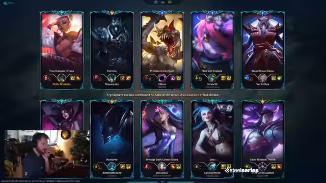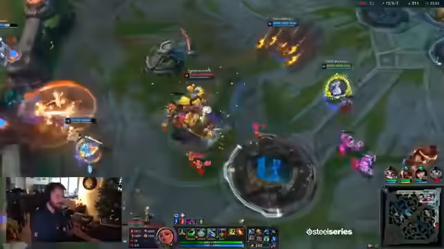 01:47:44Das Spiel ist für den Streamer zufällig und er wirft sich selbst einen Fehler vor. Er verspricht, einen Kill zu holen, landet aber zu weit vor dem Gegner und wird von Nunu-Jungler getötet. Er gibt an, dadurch seinen Lead und gutes Standing im Spiel weggeworfen zu haben, was das Team nun in eine defensive und schwierige Position zwingt.