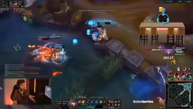 00:00:52Der Stream beginnt mit einem League of Legends-Spiel auf der Map 'Material World'. Der Streamer plant, einen geilen Bartock zu spielen und Wins zu holen. Das Team besteht aus Jinx und Lulu gegen eine Turbo-Granny. Es gibt Bedenken, ob Level 1 gewonnen werden kann, und die erste Blood-Kosten werden als sehr teuer eingestuft. Der Streamer kommentiert, dass sein ihn zurückhaltendes Team ihn nur behindert.