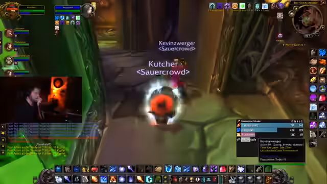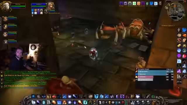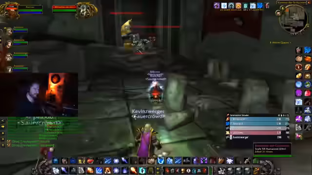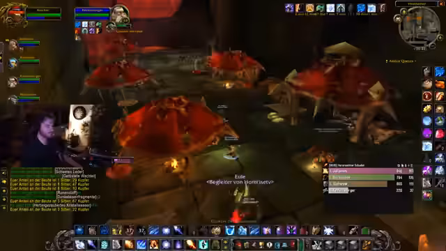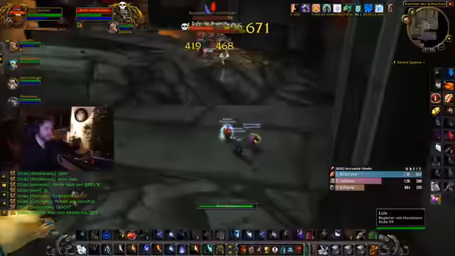 05:22:00Kevin erleidet einen Rückschlag, als er seinen Questgegenstand aus einer Kiste versehentlich wegwirft, was den Fortschritt bei einer Quest behindert. Das Team überlegt, ob sie die umliegende Mobsgruppe ignorieren oder angreifen sollen, um den Raum zu säubern. Schließlich entscheiden sie sich, den Boss 'Baron Rivendare' in den hinteren Raum zu ziehen. Der Streamer weist darauf hin, dass der Boss zufällige kleine Viecher beschwört, die man nicht unterbrechen kann. Die Taktik, diese Mobs zu ignorieren und sich auf den Boss zu konzentrieren, wird als die effektivste Strategie betrachtet.