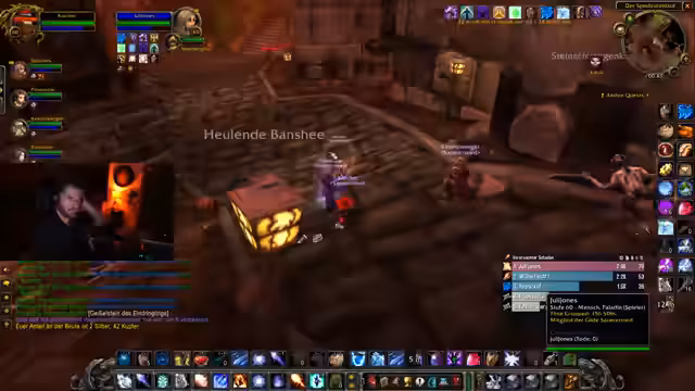 04:39:10Der Streamer unterhält sich über die Verwendung von Vornamen bei Streams, was er als persönlicher empfindet. Es kommt zu einer kleinen Verwirrung über den Namen eines Streamers, der erst als Philipp, dann als Jan genannt wird, was schließlich als 'Jan Philipp' geklärt wird. Parallel dazu organisieren sich die Streamer für den Dungeonzug. Das Ziel ist Stratholm, und es wird eine kleine Diskussion über die Anfangsphasen der Dungeons 'Häuser der Heiligen' und 'Verseuchte Jungtiere' geführt. Die Aufstellung für den Dungeon wird geplant, wobei das Team sicherstellt, dass alle auf derselben Ebene sind und alle Mitglieder anwesend sind, bevor es losgeht.