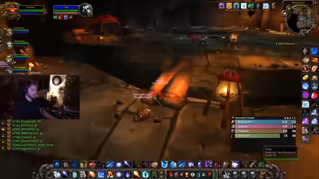 05:33:00Zwischen den Kämpfen kommt es zu lockeren Gesprächen. Der Streamer fragt das Publikum nach deren Lieblings-Horrorfilmen und erwähnt Klassiker wie 'Rubber' und 'Zom-Biber'. Parallel dazu gibt es technische discussions über Add-ons wie 'Heal Prediction Classic', das installiert werden muss, um Heilungen besser zu sehen. Der Streamer stellt auch fest, dass seine Gruppe nicht über den benötigten Schaden verfügt, um den Dungeon schnell zu bewältigen, was die anhaltenden Kämpfe verlängert.
