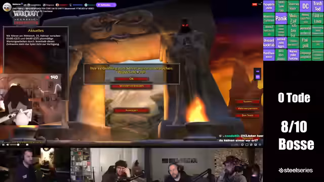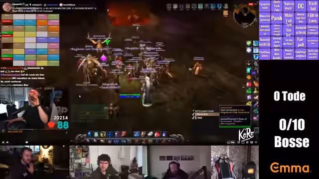 02:55:52Vor dem offiziellen Start des Raids wird über diverse Alltags-Themen gesprochen. Dazu gehören Erörterungen über Snowboard-Aktivitäten, der Verzehr von Shisha und das Planen weiterer Aktionen im Spiel, wie das Portieren zu bestimmten Spielorten oder das Besorgen von Trinkets. Auch der Hinweis auf einen Quiz-Tracker für eine spätere Hauptevent wird erwähnt. Technische Aspekte, wie das Zurückporten von Spielern, die versehentlich Post nicht mitgenommen haben, werden ebenso angesprochen, wie der allgemeine Chat und die Spannung unter den etwa 40 Streamern im gemeinsamen Kanal.