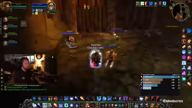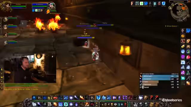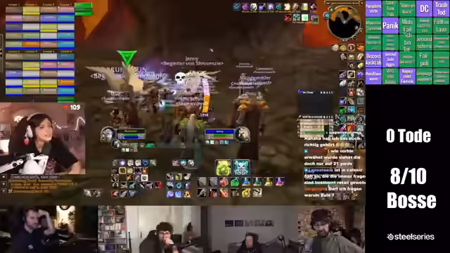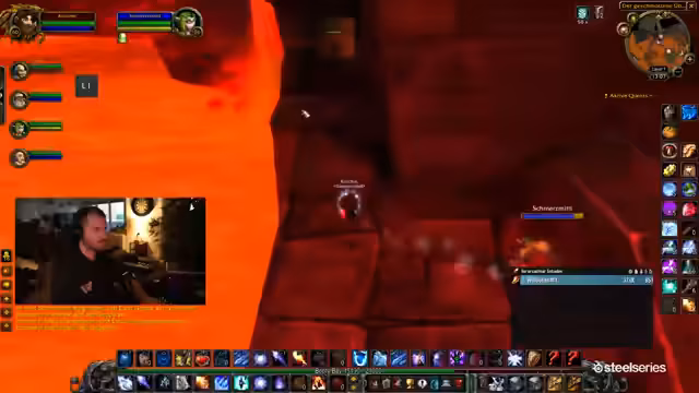 01:20:25Die Gruppe betritt endlich den Molten Core. Es kommt zum ersten Chaos, als Reaper bei den ersten Trash-Mobs unabsichtlich einen Pull auslöst und die Gruppe sich unkoordiniert verhält. Der Streamer selbst bleibt zurück und reagiert mit Humor auf die Situation. Der Fokus verlagert sich auf das Verteilen von Items, das Sammeln von benötigten Zutaten und das Portieren von Spielern in die Instanz.