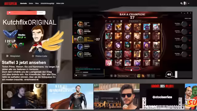 00:00:30Der Stream beginnt mit einem abendlichen League-of-Legends-Spiel. Der Streamer äußert den Wunsch nach einem geilen Pike-Abend, entscheidet sich aber letztlich für Jungle. Er startet als Kha'Zix, ein Assassinen-Champion, und führt einen Early-Game-Jungle-Invasion beim gegnerischen Jungler durch. Die ersten Minuten sind geprägt von aggressivem Mapping und strategischen Tauschen, wobei er aktiv gegen Draven und Thresh im Bot-Lane angreift.