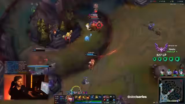 00:00:19Der Stream beginnt mit dem Kanal-Inhaber kutcherlol, der ein League of Legends-Spielt anfängt. Er spielt Poppy im Jungle und seine Gegnerin ist eine Wukong. Beide Teams kämpfen um Lane Priority und frühe Kills. Kutcherlol erzielt erste Erfolge mit zwei Kills auf Wukong und Yego, aber die Gegner kontern und canceln seine frühe Dominanz. Das Spiel entwickelt sich zu einembalanceden Anfang, bei dem beide Seiten um die Kontrolle des Spiels kämpfen.