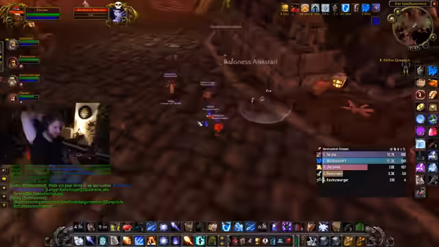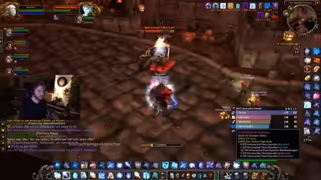 02:34:21Der Stream konzentriert sich auf einen instanzierten Dungeonlauf mit einem Team, wobei komplexe Kampftaktiken und Bossmechaniken im Mittelpunkt stehen. Es wird intensiv über die Verteilung von Buffs wie Aura und das anschaffende von heiligem Wasser gesprochen, um den Kampf zu vereinfachen. Während des Spiels treten technische Schwierigkeiten auf, wie unerwartete Spielerübernahmen und die Notwendigkeit, sofortige Anpassungen der Kampfstrategie zu treffen, um den Boss effizient zu besiegen.