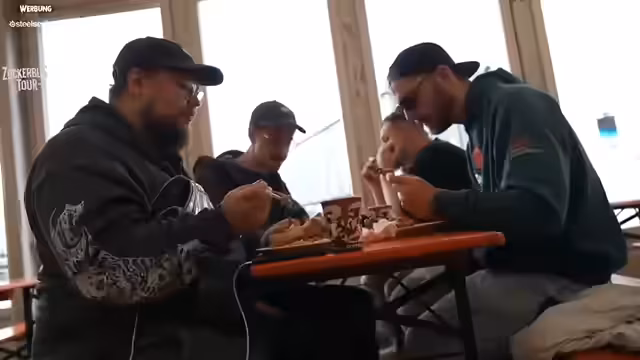 03:44:06Eine Gruppe beschließt, eine Skate-Halfpipe zu besuchen. Nachdem Teilnehmer sich an Haftungsausschlüsse unterschreiben müssen, probieren einige das Skateboard aus. Besonders hervorgehoben wird die Selbstsicherheit von 'Knirps', der als 'hyper-selbstbewusst' beschrieben wird. Die Herausforderung wird als 'extrem' und 'schmerzhaft' empfunden, aber auch als 'cooles Erlebnis' betrachtet. Die Crew filmt die Versuche für Social Media.
