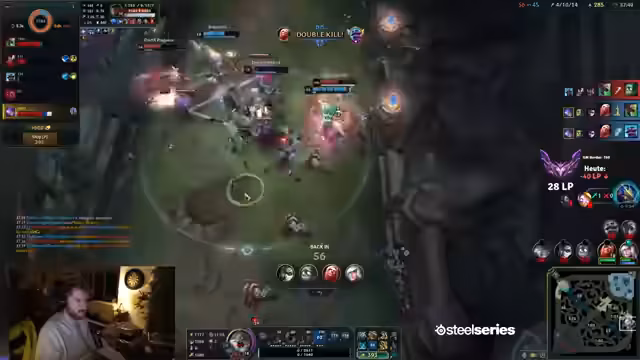 02:40:44Ein FlexQ-Spiel mit Wladimir wird als 'krank' bezeichnet, obwohl die Motivation des Champions angezweifelt wird. In der Folge kommt es zu Fehlkalkulationen im Jungle, als Tristan ein Camp von Kutcher klaut, was zu Frustration führt. Zudem wird die Kritik am Management der Lane-Priority thematisiert, insbesondere dass der Supporter den Cannon Minion für sich behält, um die Wave effektiver pushen zu können. Diese Phase ist geprägt von strategischen Fehlern und dem damit verbundenen Ärger zwischen den Spielern.