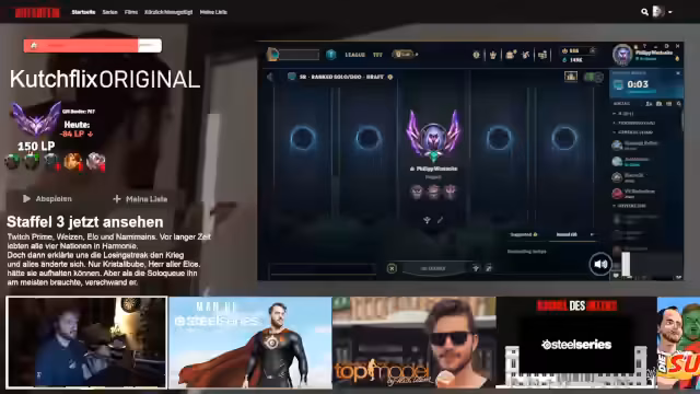 Es wurde eine League of Legends-Session absolviert, bei der mangelnde Teamkommunikation für Frustration sorgte. Ein Highlight war ein potenzieller 'Technotrain' mit dem Champion Pyke. Die Niederlage wurde auf fehlende Gegenstände und Nashor-Würfe zurückgeführt. Anschließend wurde ein Spiel mit der Champion Leona begonnen.