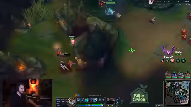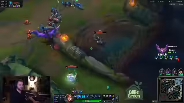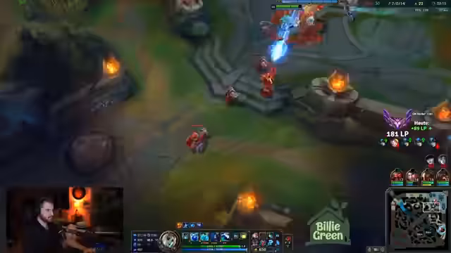 00:14:37Das Team konzentriert sich auf den ersten Drachen. Der Streamer beobachtet, wie der gegnerische Caitlyn stark aussieht, aber kritisiert den eigenen Jungler für unkoordiniertes Verhalten, was in einem verpassten Shutdown resultiert. Trotzdem pushen sie erfolgreich die Lanes. Es kommt zu einem 2-1 Trade im Mid-Lane-Bereich, der vom Streamer als Muskel-Gedächtnis-Situation beschrieben wird, bei der er fälschlicherweise denkt, ein gegnerischer Helfer sei bereits da.