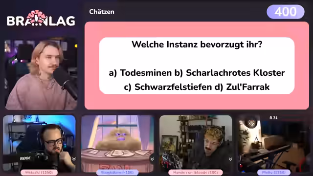 00:00:15Kutcher startet den Stream mit einem Zulfarag-Run und erwähnt die geplante Brainlag-Quiz-Session um 15 Uhr mit Blesk. Er zeigt das neu erworbene Waffen-Upgrade aus Maraudon und diskutiert die Herausforderungen beim Finden einer Gruppe für Zulfarag. Nebenbei plant er den weiteren Tagesablauf, inklusive eines Weihnachtsmarktbesuchs und möglicher IRL-Verpflichtungen. Die Vorbereitung auf das Quiz und das Projekt "SauerCrowd" werden angesprochen, bei dem über 200 Streamer gemeinsam auf Level 60 spielen wollen.