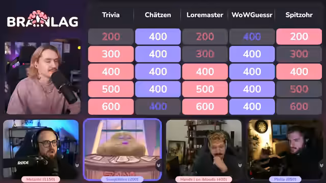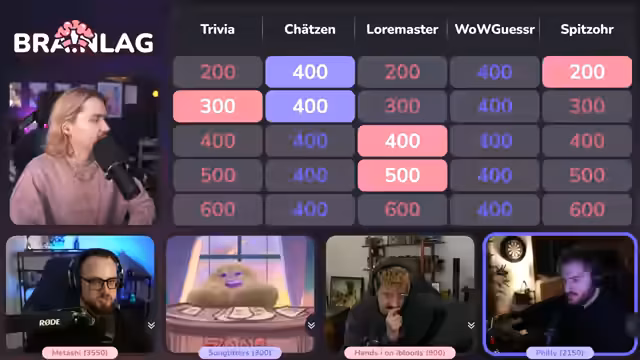 02:13:47Das Quiz beginnt mit einem Jeopardy-Style-Board, das 50 Fragen zu WoW Classic umfasst. Kutcher und andere Streamer wählen Kategorien wie "Loremaster" und beantworten Buzzer-Fragen, darunter die Zwergenclans (Bronzebart, Dunkeleisenzwerge, Wildhammer). Die Regeln zu Minuspunkten bei falschen Antworten und Joker-Einsatz werden erläutert. Technische Probleme mit Overlays und Sound werden nebenbei behoben, während die Community via StreamTogether zuschaltet.