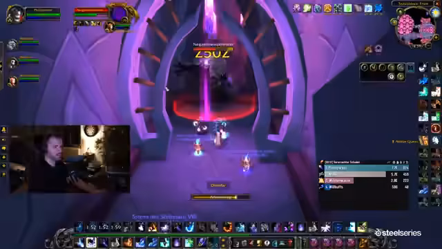 02:20:38Der Kampf gegen den ersten Boss, Moroes, beginnt. Die Streamerin übernimmt das Tanking, während die Gruppe die Adds kontrolliert. Es kommt zu einigen kritischen Momenten, bei denen ein Spieler unter einem Debuff leidet und die Heiler sofort reagieren müssen. Nach dem erfolgreichen ersten Versuch (First Try) wird der Loot verteilt. Anschließend zieht die Gruppe weiter und muss gegen starke Phantomdiener und Fatumknechte kämpfen, die durch hohen Schaden und Debuffs für Herausforderungen sorgen.