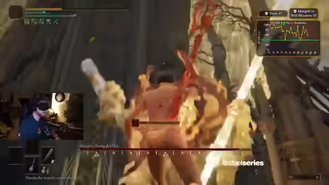 01:16:25Nachdem Malenia als zu schwierig eingeschätzt wird, wird Morgoth als potenziell leichterer Gegner für den Blind Run in Betracht gezogen. Der Streamer plant, nach einer Essenspause den Kampf gegen Morgoth zu beginnen. Während der Pause wird eine Dokumentation über die Nachtschicht auf dem Oktoberfest angesehen. Nach der Pause werden die Vorbereitungen für den Kampf gegen Morgoth getroffen. Das Overlay wird eingerichtet und der Streamer stellt die Kategorie auf Elden Ring um. Es wird überlegt, wie lange man nach vorne laufen muss, um den ersten Treffer zu landen, und es wird ein Testlauf mit offenen Augen durchgeführt, um das Timing zu bestimmen. Der Streamer stellt fest, dass er etwa neun Sekunden laufen muss, bevor er angreifen kann. Es wird versucht, den ersten Hit konsistent zu treffen, aber das erweist sich als schwierig.