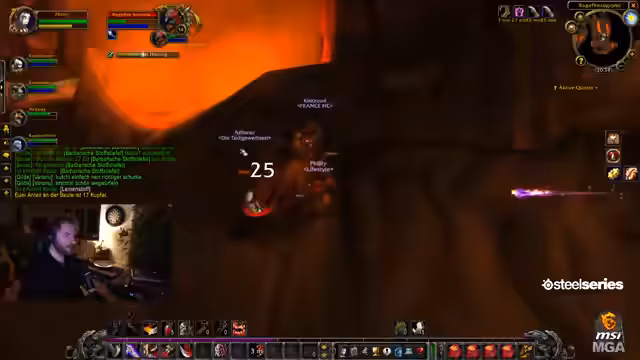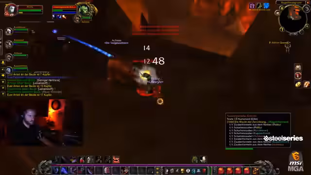 05:32:38Die Gruppe beginnt nun den Dungeon „Ragefire-Abgrund“. Der Streamer, als Tank, führt die Gruppe an und präsentiert eine sehr koordinierte und effiziente Spielweise. Er erklärt seinem Mitspieler, einem Heiler-Priester, die Mechanics des Dungeons, wie z.B. die Wellen von Feinden, und zeigt, wie man diese am besten meistert. Die Gruppe arbeitet gut zusammen und sammelt erfolgreich Erfahrungspunkte und Beute, was dem Streamer großen Spaß macht.