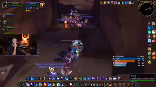 03:03:50Nach einer kurzen Pause und dem Verbrauch von Saurem Gurken-Item, das zusätzliche Mana spendet, geht es in den nächsten Dungeon. Der Streamer hat nun den Deepfire-Spec aktiv. Er versucht direkt, einen großen Pull zu starten, muss aber seine Aggro-Management-Fähigkeiten verbessern, um dem Tank die Arbeit zu erleichtern. Kevin wird für seinen hohen Schaden gelobt.