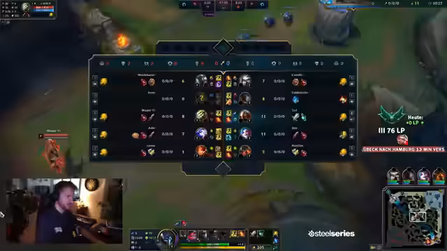 00:24:00Das Spiel nähert sich der Endphase und der Streamer erreicht sein Full-Build mit einem Serpentfang. Er hat ein hohes Level und großen Schaden, wird aber durch den starken Mordekaiser und die gegnerische Ashe bedroht. Ein Fehltritt führt zu einem eigenen Tod und einem Shutdown für die Gegner, was der Streamer selbst kritisiert. Das Team ist in einer schwierigen Position, kann jedoch im Teamfight noch einmal punkten, bleibt aber ohne ultimatives Teammitglied.
