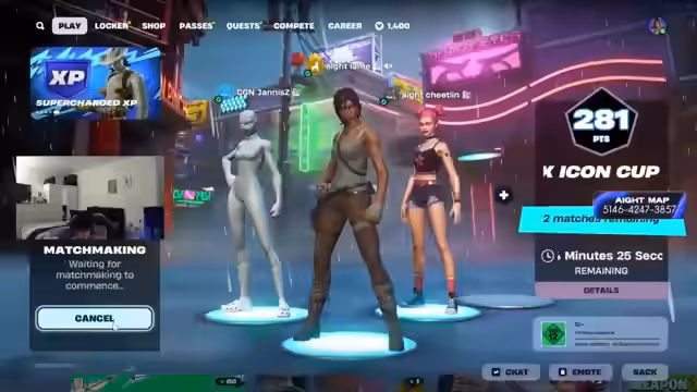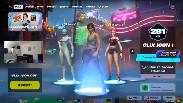 00:00:00Der Clix Cup beginnt mit den Streamern Lame, Cheetiin und JannisZ, die in einem gemeinsamen Lobby-Event antreten. Die ersten Minuten sind von raschen Landeentscheidungen geprägt, wobei sich das Team für eine Position mit durchgemischtem Loot entscheidet. Der Streamer berichtet von anfänglichem Pech mit der Beute und findet nur eine Outlaw-Schrotflinte, was zu einer langsameren Anfangsphase führt. Ein Zusammenstoß mit einem gegnerischen Team am Zug führt zu einem frühen Feuergefecht, bei dem das Team knapp überleben kann, aber bereits erste Verluste erleidet und den ersten Eliminierenden aus dem Spiel gibt.