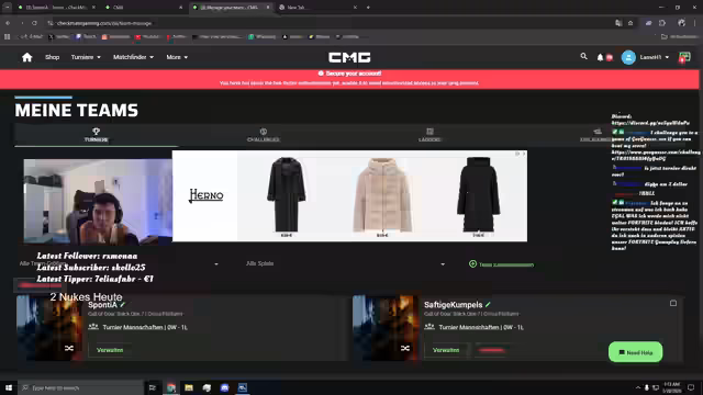 03:24:21Der Streamer versucht, ein Turnier namens 'Dings' aufzubauen oder teilzunehmen. Er kommuniziert im Chat und sucht aktiv nach Mitspielern für ein Team. Die Kommunikation ist von einem Mix aus Eile und Frustration geprägt, da er schnell eine Gruppe zusammenstellen möchte, aber auf die Reaktion der anderen wartet.