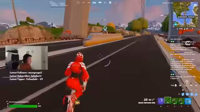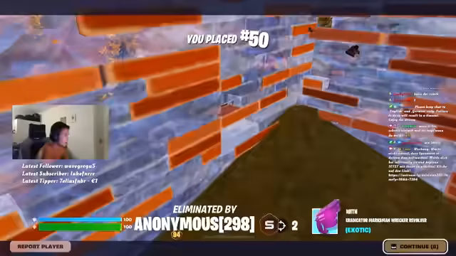 01:48:27Ein wiederkehrendes Problem ist die ungewollt ausgefahrene Pickaxe, die den Streamer behindert und ihn neidisch auf den Rang eines Top-16.000-Spielers macht. Die technische Ursache, möglicherweise ein Makro, wird ausgeschlossen. Gleichzeitig wird der Wettbewerb im Fortnite-Bereich thematisiert. Der Streamer erwähnt, dass Konkurrenten wie Fredoxi wieder aktiv werden, und äußert seine eigene Unlust am Stress des Wettbewerbs und dem Gefühl, als Fluch auf seine Mitspieler zu wirken.