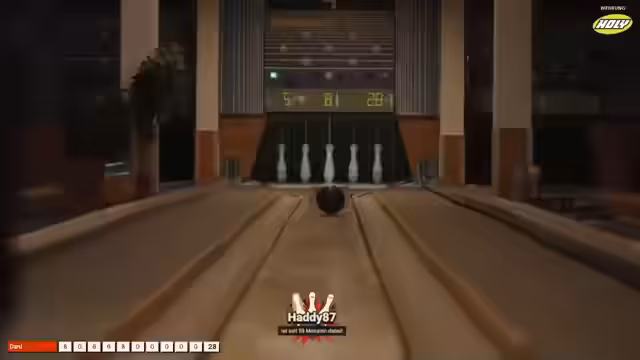 00:47:37Das erste Spiel 'In die Vollen' beginnt mit Lara als erster Starterin. Sie wirft einen starken Auftakt und landet als erste eine Neune, was für viel Begeisterung im Chat und bei den anderen Teilnehmern sorgt. Ihnen folgen Paul, Olli und Dani, die jeweils konstante Leistungen zeigen. Paul gelingt ein Schnitt von 7,2 und stellt damit die bis dahin beste Leistung. Olli und Dani landen im Schnitt bei 6,4. Während des Spiels wird die Kommentierung von Mori übernommen, der den technischen Ablauf, die Besonderheiten der Bohlebahn und die taktischen Aspekte erläutert und so für Unterhaltung sorgt.