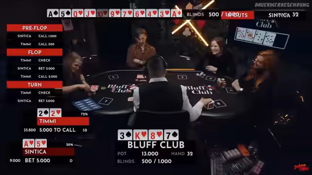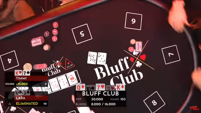 01:53:27Das Turnier ist geprägt von extremen Wendungen. Caro hat eine Siegeshand im Auge, ein Flush, doch mit dem letzten am River erscheinenden Karo gewinnt Lara mit einem Full House, während Caro auf einer verlorenen Straße sitzt. Syndika wird ebenfalls auf der letzten Karte ausgeschieden, als sie trotz einer hohen Gewinnwahrscheinlichkeit (78 %) auf die entscheidende Karte warten muss. Nach mehreren Ausscheidungen befinden sich nur noch wenige Spieler im Rennen, darunter Lara, Caro und Timmy, während Lara weiterhin eine dominante Position als Chip-Leaderin einnimmt.
